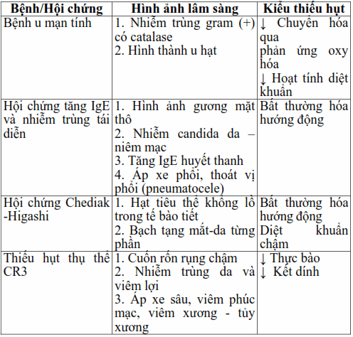 Bảng. Các kiểu thiếu hụt chức năng neutrophil chủ yếu gây ra nhiễm trùng tái phát nhiều lần.