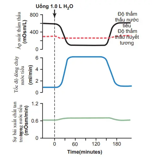 Hình cho thấy các phản ứng gần đúng của thận trong một người sau khi uống 1 lít nước. Lưu ý rằng thể tích nước tiểu tăng lên đến khoảng 6 lần bình thường trong vòng 45 phút sau khi nước đã được uống.