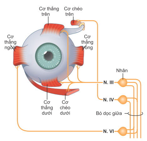 Các nhân dây thần kinh vẫn nhãn III, IV và VI ở thân não và sự tiếp nối của chúng với các dây thần kinh ở ngoại vi đến chi phối cho các cơ vận nhãn. Hình vẽ cũng mô tả tương quan giữa các nhân trên thông qua một dải thần kinh gọi là bó dọc giữa. Mỗi ba nhóm cơ ở mỗi mắt được phân bố thần kinh để tương hỗ phù hợp, trong khi cơ này giãn thì cơ kia co (và ngược lại).