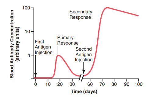 Hình. Diễn biến thời gian của phản ứng kháng thể trong máu tuần hoàn đối với lần tiêm kháng nguyên chính và đến lần tiêm thứ cấp vài tuần sau đó.