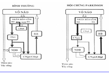 Sơ đồ: Ðường dẫn truyền trực tiếp và gián tiếp của hạch nền trên người bình thường và hội chứng Parkinson. Sự tăng hoạt trình bày bằng các mũi tên đậm. Hai loại thụ thể dopamine D1 và D2 trong nhân bèo sẫm. CNpn: Cầu nhạt phần ngoài, CNpt: Cầu nhạt phần trong, CÐpl: chất đen phần lưới, CÐpđ: Chất đen phần đặc, NDÐ:Nhân dưới đồi thị, BB: Nhân bung bên đồi thị ( Theo Wichmann T., Delong MR, Movement Disorders: Neurologic principile and practice, Watt and Koller,1997).