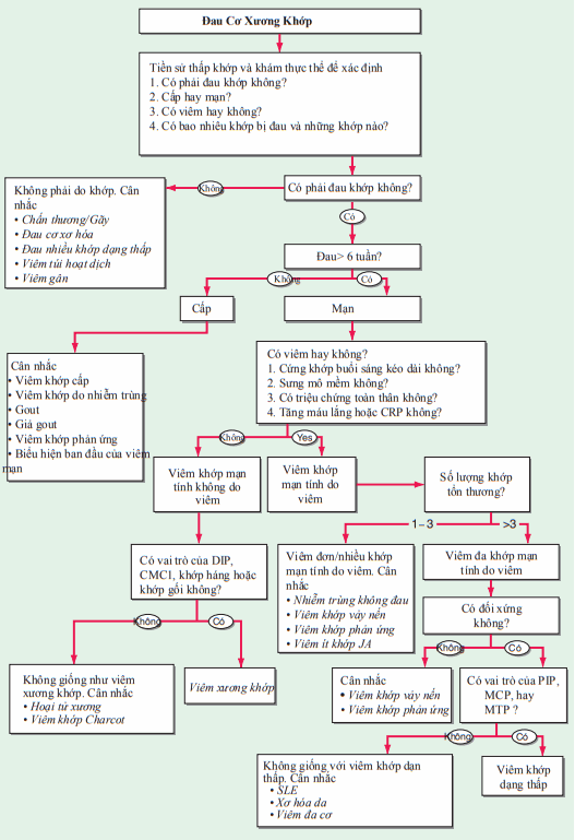 Hình. Sơ đồ chẩn đoán các bệnh đau xương khớp. Tiếp cận với các chẩn đoán phân biệt (xem chữ in nghiêng). CMC, carpo-metacarpal (khớp cổ đốt bàn); CRP, C-reactive protein; DIP, distal interphalangeal (khớp gian đốt xa); ESR, erythrocyte sedimentation rate (tốc độ máu lắng); JA, juvenile arthritis (viêm khớp tự phát ở thiếu niên); MCP, metacarpophalangeal (khớp bàn ngón); MTP, meta-tarsophalangeal (khớp bàn ngón chân cái); PIP, proximal interphalangeal (khớp gian đốt gần); SLE, systemic lupus erythematosus (Lupus ban đỏ hệ thống).