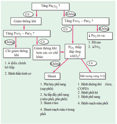 Bốn cơ chế cơ bản gây hạ oxy máu là (1) giảm PO2 hít vào, (2) giảm thông khí, (3) shunt, và (4) mất tương xứng giữa thông khí/tống máu. Giảm PO2 hít vào (ví dụ: độ cao) và giảm thông khí (đặc trưng bởi tăng PaCO2) cả hai trường hợp giảm oxy máu động mạch gây nên bởi giảm oxy phế nang; vì vậy, (A − a) gradient vẫn bình thường. Dòng shunt (ví dụ, dòng shunt ở tim) gây hạ oxy máu bằng cách đi vòng quanh các mao mạch phế nang. Dòng shunt được đặc trưng bởi sự tăng (A − a) gradient và khó hồi phục khi bổ sung O2. Mất tương xứng giữa thông khí/tống máu là nguyên nhân hay gặp nhất gây hạ oxy máu, nó liên quan tới sự tăng (A − a) gradient, nhưng sự bổ sung O2 đáp ứng lại sự thiếu oxy bằng cách tăng thể tích oxy máu từ những vùng có tỉ lệ thông khí/tưới máu thấp. Một sơ đồ tiếp cận bệnh nhân hạ oxy máu được trình bày tại Hình.