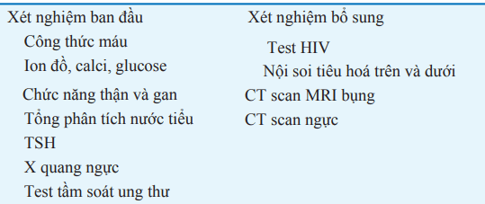 Đánh giá cận lâm sàng ban đầu được liệt kê trong Bảng, điều trị thích hợp dựa vào nguyên nhân nền gây sụt cân. Nếu không tìm thấy nguyên nhân, nên theo dõi lâm sàng cẩn thận, hơn là làm các xét nghiệm liên tục mà không có định hướng. Không có xét nghiệm nào bất thường là một dấu hiệu tiên lượng tốt.