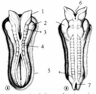 1. máng thần kinh, 2. khoang màng ngoài tim, 3, tấm thính giác, 4. khúc nguyên thủy, 5. màng ối, 6. lỗ thần kinh trước, 7. lỗ thần kinh sau.