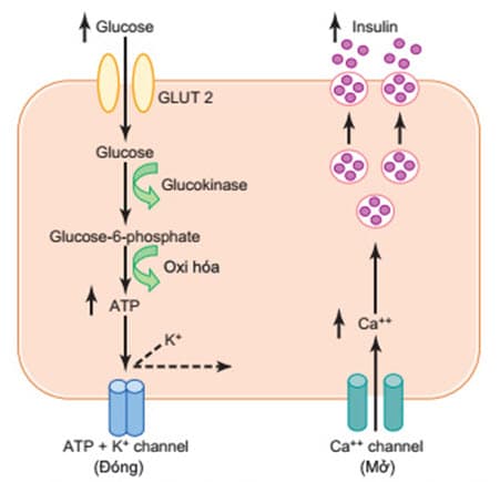 Glucose-6-phosphat sau đó bị oxy hóa để hình thành ATP, gây ức chế kênh K+ nhạy cảm với ATP (ATP-sensitive potassium channels) của tế bào. Kênh kali đóng gây khử cực màng tế bào, làm mở kênh calci (voltage-gated calcium channels), kênh nhạy cảm với sự thay đổi điện thế của màng. Hiệu ứng này làm cho Calci vào tế bào kích thích những túi chứa insulin đi ra kết hợp với màng tế bào dẫn đến insulin được bài tiết theo hiện tượng xuất bào.