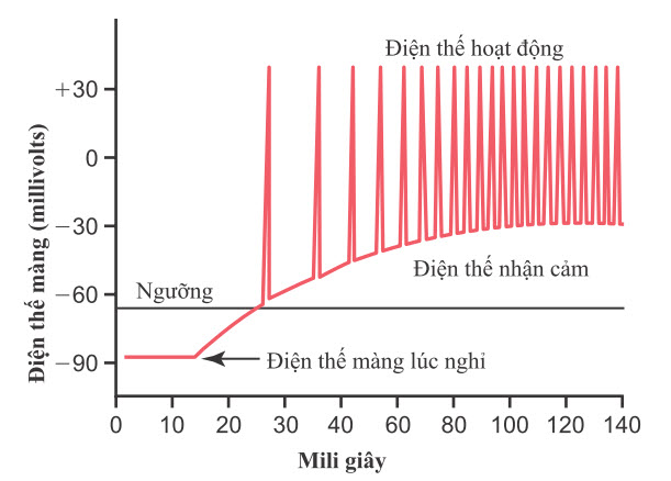 Khi điện thế nhận cảm tăng trên ngưỡng sẽ xuất hiện điện thế hoạt động trong sợi thần kinh gắn với receptor, từ đó, điện thế hoạt động sinh ra.