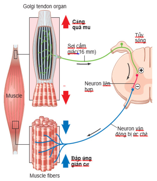 Hình. Phản xạ gân Golgi. Sự căng cơ quá mức sẽ kích thích các thụ thể cảm giác trong cơ quan gân Golgi. Tín hiệu từ các thụ thể được truyền qua sợi thần kinh hướng cảm giác kích thích interneuron ức chế trong tủy sống, ức chế hoạt động của neuron vận động phía trước, gây giãn cơ và bảo vệ cơ chống lại sự căng thẳng quá mức.