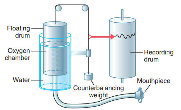 Sự thông khí phổi có thể đánh giá bởi ghi hình thể tích không khí chuyển động vào và ra phổi, phương pháp này gọi là thăm dò dung tích phổi. Thiết bị đo dung tích phổi được chỉ ra trên hình 38-5. Nó gồm 1 cái trống xoay tròn quanh 1 cái buồng chứa nước, cái trống được giữ cân bằng bởi 1 cái quả tạ. Trong cái trống là khi thở, thường là không khí hoặc oxy; 1 cái ống kết nối miệng với buống khí. Khi 1 lần thở vào và ra buồng, trống lên và xuống, và ghi hình trên giấy.
