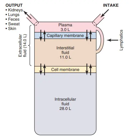 Hình. Điều hòa dịch của cơ thể, bao gồm các ngăn chính của cơ thể và các màng ngăn cách các ngăn này. Các giá trị được hiển thị ở một người đàn ông trưởng thành trung bình 70 kg.