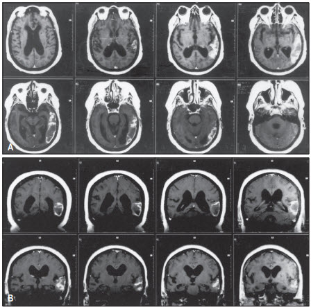 Hình. MRI của bệnh nhân thất ngôn Wernicke gây nên bởi tổn thương thùy thái dương. A, hình ảnh cắt ngang; B, hình ảnh cắt dọc.